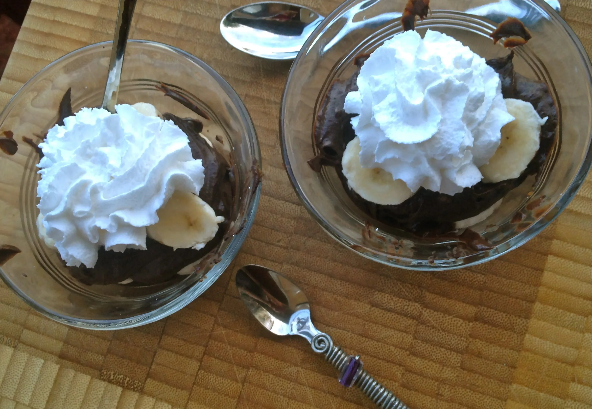 Spoon the avocado into a large bowl, add the other ingredients and begin mixing with a hand mixer. Once all of the ingredients are combined, use a rubber spatula to scrape the edges, and keep mixing—the more you mix, the smoother it will become. When you’ve blended it to the consistency you want, layer the mousse in dessert cups (four of them) with slices of banana. Top with whipped topping and enjoy!